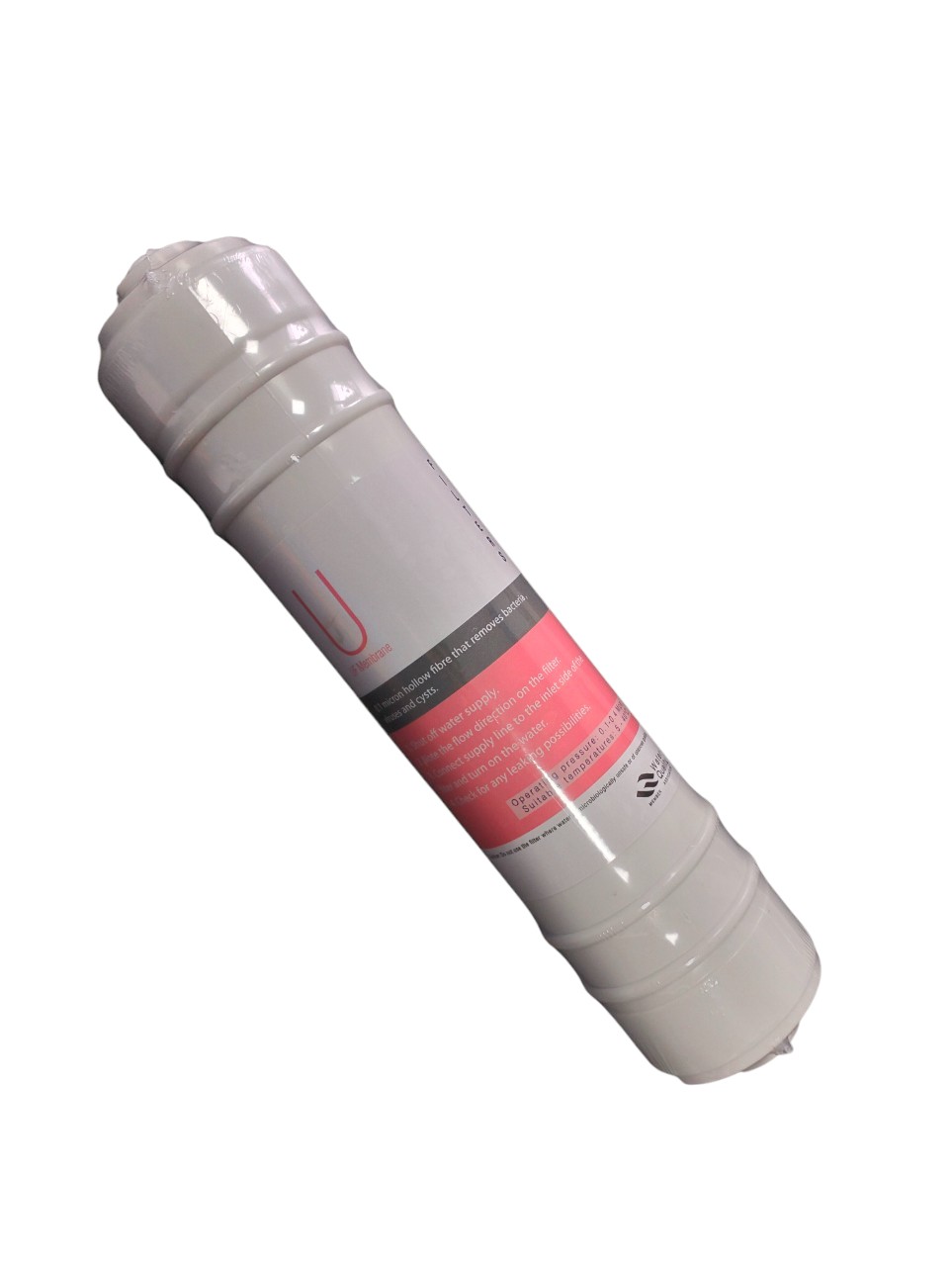 UF (ultrafiltraciona) membrana zadržava bakterije, koloide i suspendovane čestice do 0,1 mikrona, dok propušta čistu vodu sa očuvanim mineralima. Koristi se kao post-filter ili kao poseban stepen dubinskog prečišćavanja.